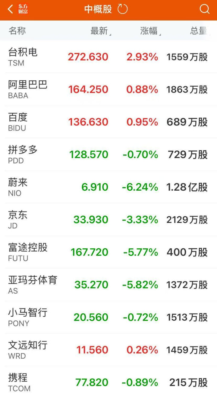 中概股多数下跌,纳斯达克中国金龙指数跌0.96%。个股方面,老虎证券跌超9%,蔚来跌逾6%,京东集团跌超3%,腾讯音乐跌超3%,亿航智能跌超2%;世纪互联涨超4%,爱奇艺涨超3%,禾赛科技涨超2%,万国数据涨近2%。